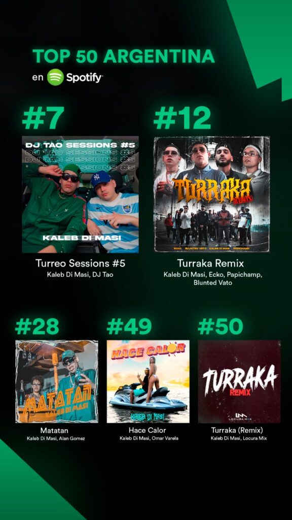 Durante el 2021, Kaleb Di Masi no paró de conquistar los charts más importantes de la música. Alcanzó el puesto #1 del Top 50 de Spotify Argentina y Uruguay dando paso a que se sumen al ranking otros grandes hits como: “Matatan” junto a Alan Gómez, “Turreo Session #5” con DJ Tao, “Turraka Remix” con Locura Mix, “Hace Calor” junto a Omar Varela y su recientemente colaboración de “Que a pasao Remix” de Big Apple junto a Pablito Lezcano de Damas Gratis y Homer El Mero Mero.